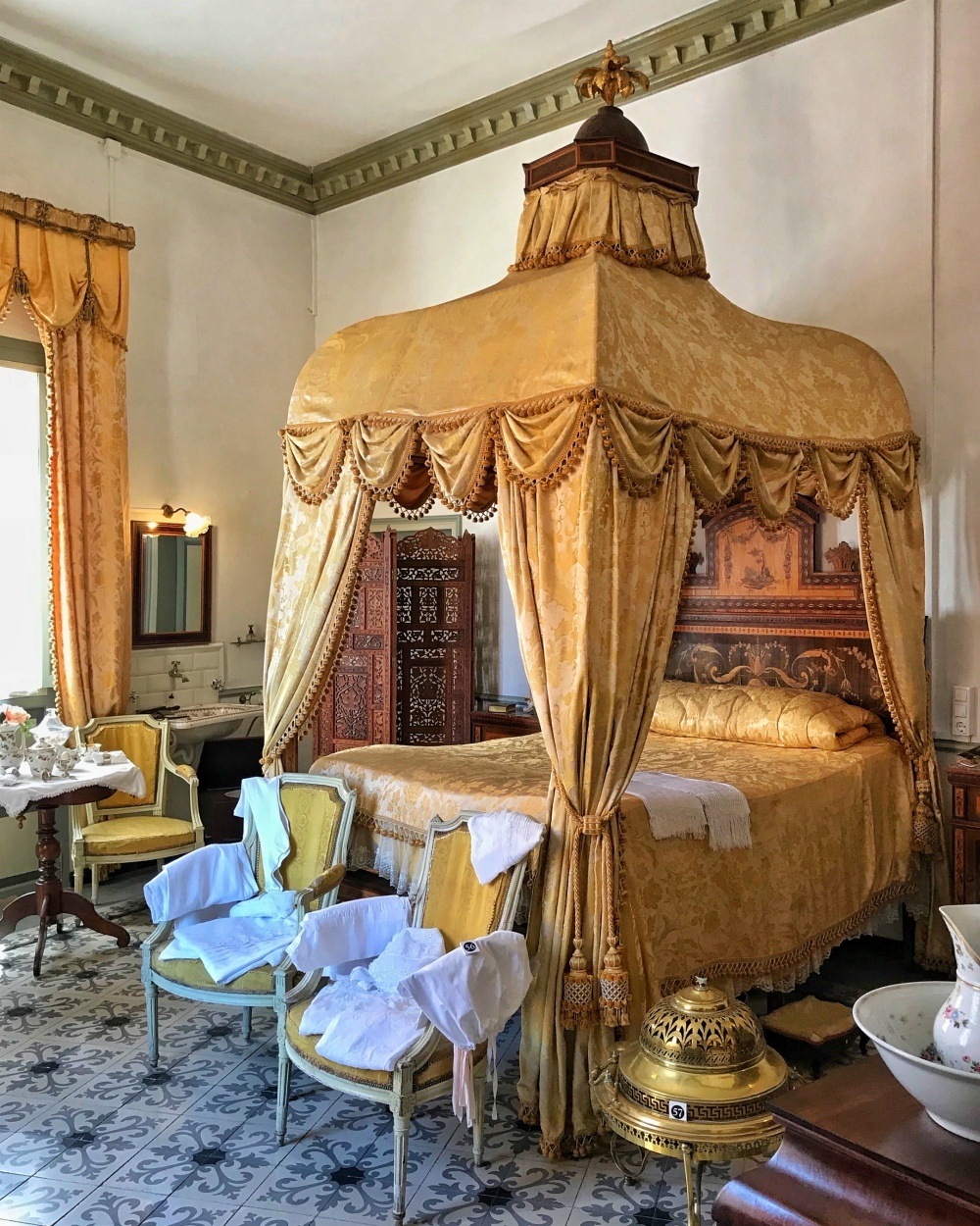 A table in the dining room is set with the finest cut glass and silver and the romantic bedroom is hung with yellow silk damask curtains. It has a bow window or Boínder, a common feature of Menorcan town houses, allowing a good view over what was happening in the street.